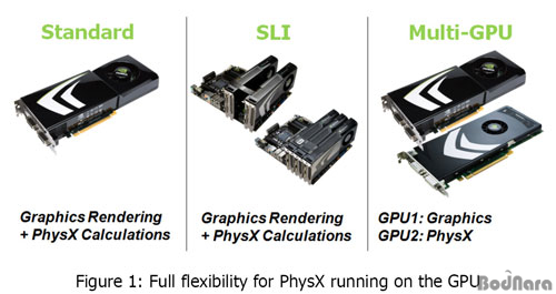 NVIDIA¿¡¼­ Á¦°øÇÏ´Â NVIDIA PhysX ±¸¼ºÀº ¾Õ¼­ ¾ð±ÞÇÏ¿´´ø °Í°ú °°ÀÌ ±×·¡ÇÈ Çϳª¸¸À¸·Î ±×·¡ÇȰú PhysX ¿¬»êÀ» ÇÏ´Â ½ºÅÄ´Ùµå, µ¿ÀÏÇÑ µÎ °³ÀÇ Ä«µå·Î ¼º´ÉÀ» ³ôÀÌ´Â SLI ±¸¼ºÀ» ÅëÇØ ±×·¡ÇȰú PhysX ¿¬»êÀÇ º´Çà, ±×¸®°í ¸¶Áö¸·À¸·Î ¼­·Î ´Ù¸¥ µÎ °³ÀÇ Ä«µå·Î Çϳª´Â ±×·¡ÇÈÀ» ³ª¸ÓÁö Çϳª´Â PhysX ¿¬»êÀ» ÁøÇàÇÏ´Â ¸ÖƼ GPUÀÇ 3°¡Áö ±¸¼ºÀ» »ç¿ëÇÒ ¼ö ÀÖ´Ù. SLI ±¸¼ºÀº SLI Áö¿ø ¸ÞÀκ¸µå°¡, ¸ÖƼ GPU ±¸¼ºÀÇ °æ¿ì µÎ °³ ÀÌ»óÀÇ ±×·¡ÇÈ Ä«µå¸¦ »ç¿ëÇÒ ¼ö ÀÖ´Â PCIe x16 ½½·Ô µîÀÌ ÃÖ¼Ò 2°³´Â Á¦°øµÇ¾î¾ß »ç¿ëÇÒ ¼ö ÀÖ´Ù. ÇÏÁö¸¸, ÇöÀç À©µµ¿ì ºñ½ºÅ¸ ȯ°æ¿¡¼­ ¸ÖƼ GPU ±¸¼ºÀ» À§Çؼ­´Â µå¶óÀ̹ö ¹®Á¦·Î ÀÎÇØ ºÒÆíÇÔÀÌ ÀÖ°í À̸¦ ÇØ°áÇÒ ¼ö ÀÖ´Â ¹æ¹ýµµ ÀÖÀ¸¸ç, ÀÌ ¹®Á¦¸¦ ÇØ°áÇÑ µå¶óÀ̹öµµ µîÀåÇÒ °ÍÀ¸·Î ¾Ë·ÁÁö°í ÀÖ´Ù.