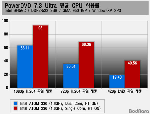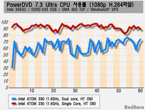 H.264 Æ÷¸ËÀ¸·Î ¸¸µç 1080p ÇØ»óµµÀÇ HD µ¿¿µ»óÀ» Àç»ýÇÏ´Â µ¿¾È CPU »ç¿ë·üÀ» ÃøÁ¤ÇÑ °á°ú, ½Ì±Û ÄÚ¾î ¾ÆÅè 230ÀÇ °æ¿ì´Â ÇÏÀÌÆÛ½º·¹µùÀ» »ç¿ëÇÑ »óÅ¿¡¼­µµ 90%¸¦ ³Ñ´Â »ç¿ë·üÀ» ±â·ÏÇßÀ¸¸ç Àç»ýµÇ´Â È­¸éµµ ¼Ò¸®¿Í ´Þ¸® Á¶±Ý¾¿ ²÷°Ü¼­ ¿øÈ°ÇÑ µ¿¿µ»ó °¨»óÀÌ ¾î·Á¿ü´Ù.