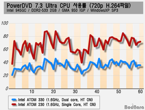 °°Àº H.264 Æ÷¸ËÀÇ µ¿¿µ»óÀ» 720p·Î ¸¸µé¾î Àç»ýÇÑ °á°ú ½Ì±Û ÄÚ¾î ¾ÆÅè 230 ½Ã½ºÅÛµµ 60% ¼öÁØÀÇ CPU »ç¿ë·üÀ» ±â·ÏÇßÀ¸¸ç ÇÁ·¹ÀÓ µå·Ó ¾øÀÌ Àç»ýÀÌ °¡´ÉÇØÁ³´Ù. ÇÏÁö¸¸ µà¾ó ÄÚ¾î ¾ÆÅè 330ÀÌ µé¾î°£ D945GCLF2ÀÇ °æ¿ì CPU »ç¿ë·üÀÌ ÈξÀ ³·¾ÆÁ®¼­ 30~40% ¼öÁØÀ¸·Î ³»·Á°¬´Ù. ÀÌ Á¤µµ¸é µ¿¿µ»óÀ» Ç÷¹ÀÌÇϸ鼭 ´Ù¸¥ ÀÛ¾÷µµ ÇÔ²² ¼öÇàÇÏ´Â ¸ÖƼ ŽºÅ·µµ °¡´ÉÇÑ ¼öÁØÀÌ´Ù.