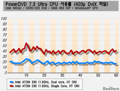 °¢ µ¿¿µ»ó Àç»ý½Ã Æò±Õ CPU »ç¿ë·üÀ» ºñ±³ÇÏ¸é µà¾ó ÄÚ¾î ¾ÆÅè 330ÀÌ ½Ì±Û ÄÚ¾î ¾ÆÅè¿¡ ºñÇØ CPU »ç¿ë·üÀÌ È®½ÇÈ÷ ³»·Á°£ °ÍÀ» º¼ ¼ö ÀÖ´Ù. ³»Àå ±×·¡ÇÈÀÇ µµ¿òÀ» ¹ÞÁö ¸øÇÏ´Â ¾ÆÅè Ç÷§ÆûÀÇ °æ¿ì ÄÚ¾î ¼ýÀÚ¿¡ µû¶ó µ¿¿µ»ó Àç»ý¿¡¼­ È®½ÇÇÑ À̵æÀ» º¸°ÔµÈ´Ù. µû¶ó¼­ D945GCLF2 ±â¹ÝÀÇ ½Ã½ºÅÛÀÌ ½Ì±Û ÄÚ¾î ¾ÆÅèÀÌ µé¾î°£ ³Ýž¿¡ ºñÇØ µ¿¿µ»ó Àç»ý¿¡¼­ ÈξÀ À¯¸®ÇÑ À§Ä¡¸¦ Â÷ÁöÇÑ´Ù°í ÇϰڴÙ.