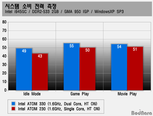 ½Ã½ºÅÛ ¼Òºñ Àü·Â ÃøÁ¤ °á°ú °°Àº ÀÎÅÚ ¾ÆÅè ÇÁ·Î¼¼¼­ ±â¹Ý ¸ÞÀκ¸µå¿¡ ¸Þ¸ð¸® 1°³, PS/2 Űº¸µå 1°³, USB ¸¶¿ì½º 1°³, HDD 1°³, ODD 1°³¸¦ ÀåÂøÇÑ ½Ã½ºÅÛÀÇ °æ¿ì ½Ì±Û Äھ¼­´Â Idle ¸ðµå ¼Òºñ Àü·ÂÀÌ 43W¿´°í µà¾ó ÄÚ¾î ¾ÆÅèÀÌ µé¾î°£ D945GCLF2¿¡¼­´Â 49W¸¦ ±â·ÏÇß´Ù.
