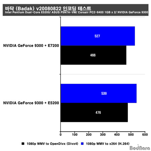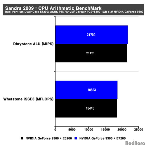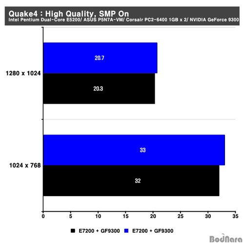 °ÔÀÓ ¼º´É¿¡¼­´Â CPU°¡ E5200¿¡¼­ E7200À¸·Î ¹Ù²î¾ú°í ³»Àå ±×·¡ÇÈÀº GF9300 ±×´ë·ÎÀ̹ǷΠCPU ¼º´ÉÀÌ ÇÊ¿äÇÑ ÀϺΠÇÁ·Î±×·¥°ú ´Þ¸® °ÔÀÓ¿¡¼­´Â Å« Çâ»óÀ» ¾òÁö´Â ¸øÇß´Ù. °á±¹, ³»Àå ±×·¡ÇÈÀÎ GeForce 9300Àº E5200À» »ç¿ëÇØµµ ¼º´ÉÀ» ²ø¾î³¾ ¼ö ÀÖ´Â °ÍÀ» ¸»ÇØÁÖ°í ÀÖ´Ù.