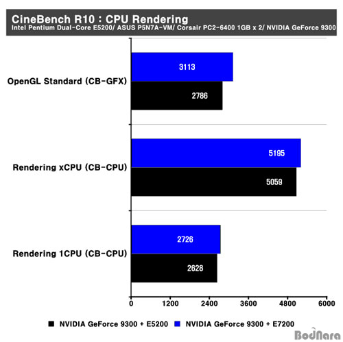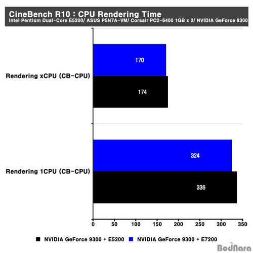 CPU¿Í GPUÀÇ ·»´õ¸µ ó¸® ´É·ÂÀ» È®ÀÎÇÒ ¼ö ÀÖ´Â CineBench R10ÀÇ °á°ú´Â ¾à°£ÀÇ Å¬·°°ú FSB°¡ ³ôÀº E7200ÀÇ Àü¹ÝÀûÀΠó¸® ¼º´É°ú ó¸® ½Ã°£ÀÌ ´õ »¡¶úÀ¸¸ç, GPUÀÇ ¼º´ÉÀÌ Æ÷ÇԵǴ OpenGLÀÇ °á°úµµ ó¸® ¼º´ÉÀÌ Áõ°¡Çß´Ù.