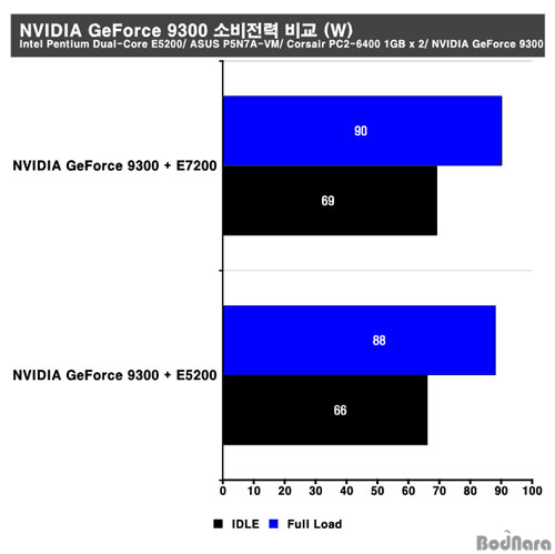 À̹ø¿¡´Â E5200°ú E7200À» GF9300°ú °¢°¢ Á¶ÇÕÇÏ¿´À» ¶§ÀÇ ¼ÒºñÀü·ÂÀ» ºñ±³Çß´Ù. ¼ÒºñÀü·ÂÀº Å×½ºÆ®¸¦ ÁøÇàÇÑ Àüü ½Ã½ºÅÛÀÇ ¼ÒºñÀü·ÂÀ¸·Î ±×·¡ÇÈ Ä«µå º¥Ä¡¸¶Å© ÇÁ·Î±×·¥ÀÎ 3DMark06À» 1920 x 1200, 4xAA/ 16xAF¸¦ Àû¿ëÇÑ ÈÄ ºñ±³Çß´Ù.