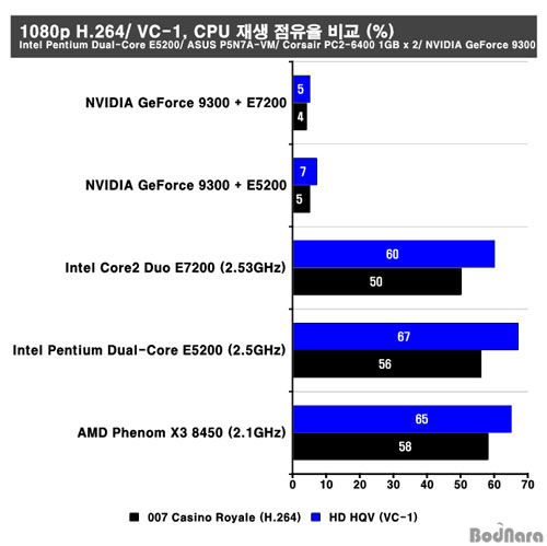 À̹ø¿¡´Â E5200°ú E7200À» GeForce 9300°ú Á¶ÇÕÇÏ¿© 1080p H.264/ VC-1 ŸÀÌÆ²À» Àç»ýÇÒ ¶§ÀÇ CPU Á¡À¯À²°ú ¼ÒºñÀü·Â, ±×¸®°í Àüü ½Ã½ºÅÛÀÇ ¼ÒºñÀü·ÂÀ» ºñ±³Çß´Ù.