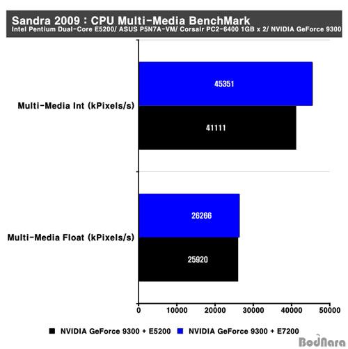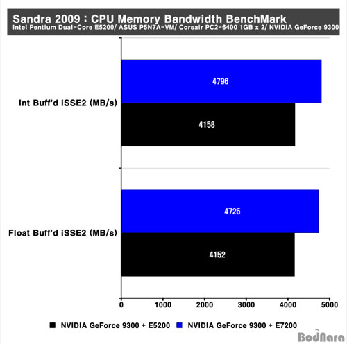»êµå¶ó 2009¿¡¼­ CPU ¿¬»ê ¼º´ÉÀº E5200°ú E7200ÀÌ ±Ù¼ÒÇÑ Â÷À̸¦ º¸¿´À¸³ª CPU ¸ÖƼ¹Ìµð¾î ó¸® ¼º´É¿¡¼­´Â E7200ÀÌ Àü¹ÝÀûÀ¸·Î ¿ì¼öÇÏ°Ô ³ªÅ¸³ª FSB Çâ»ó°ú Áõ°¡µÈ Ŭ·°ÀÌ ¿µÇâÀ» ÁÖ°í ÀÖ´Â °ÍÀ» È®ÀÎÇÒ ¼ö ÀÖ´Ù. ¸Þ¸ð¸® ´ë¿ªÆø ¿ª½Ã FSB Çâ»ó¿¡ µû¶ó ´õ ³ôÀº Çâ»óÀ» º¸¿´´Ù.