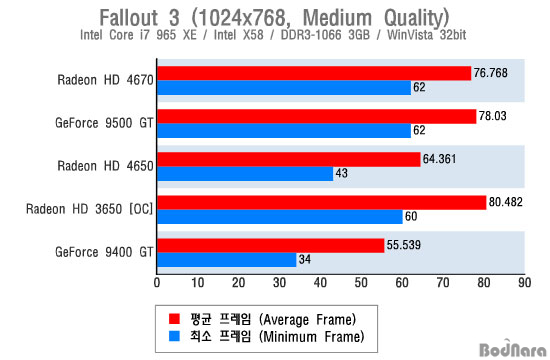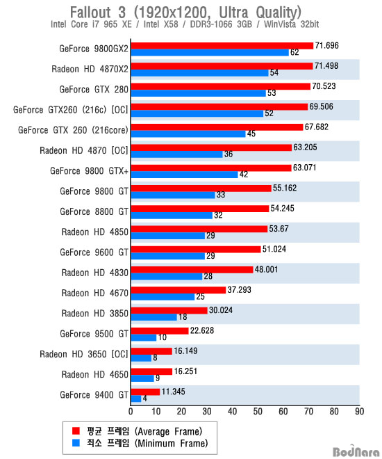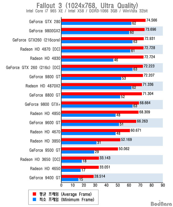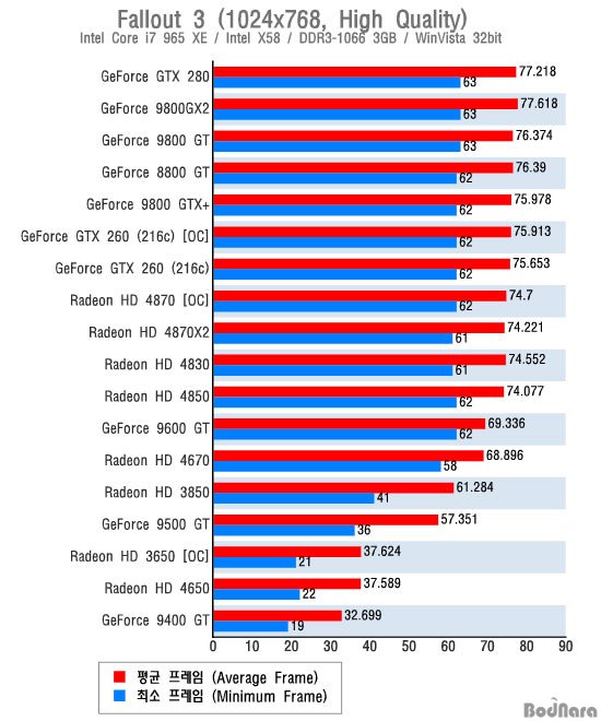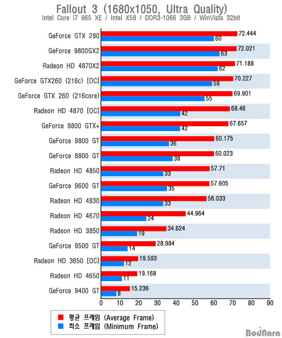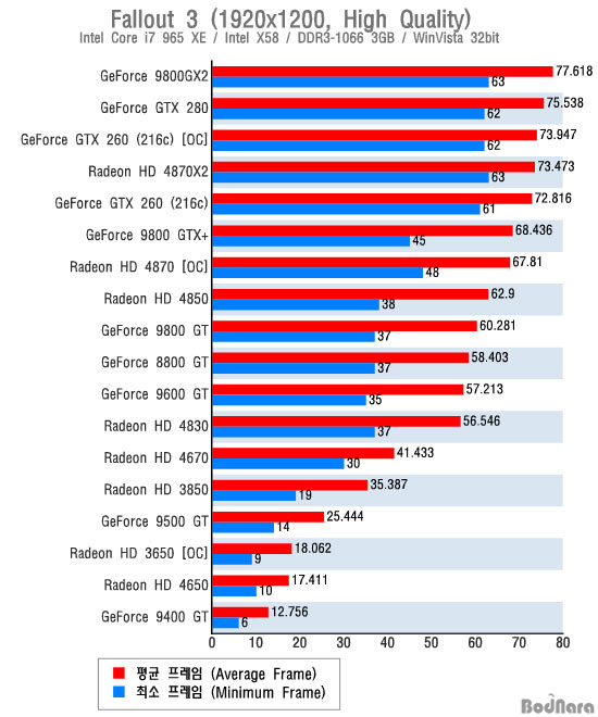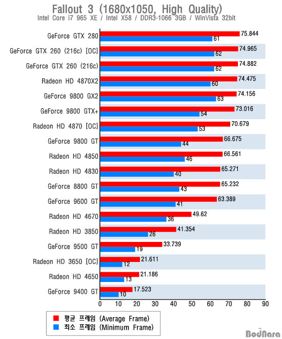 1680x1050 ÇØ»óµµÀÇ Hight ¿É¼Ç Å×½ºÆ® °á°úµµ ÁöÆ÷½º GTX 280¿¡¼ ¶óµ¥¿Â HD 4870 1GB ¿À¹öŬ·° ¸ðµ¨±îÁö°¡ 70~75 ÇÁ·¹ÀÓ »çÀÌ·Î ÃÖ»óÀ§ µî±ÞÀ̸ç, ÁöÆ÷½º 9800 GTºÎÅÍ 9600 GT±îÁö°¡ 60 ÇÁ·¹ÀÓ´ë·Î »óÀ§ ±×·ìÀ̾ú´Ù. ¶óµ¥¿Â HD 4670°ú 3850, ÁöÆ÷½º 9500 GT´Â ¼øÂ÷ÀûÀ¸·Î ¼º´ÉÀÌ ³»·Á°¡´Ù ¶óµ¥¿Â HD 3650 OC ¹× 4650ÀÌ 20 ÇÁ·¹ÀÓ´ë ÃʹÝÀ¸·Î ÇÏÀ§±Ç, ÁöÆ÷½º 9400 GT°¡ 17 ÇÁ·¹ÀÓÀ¸·Î ÃÖÇÏÀ§¸¦ ±â·ÏÇß´Ù.