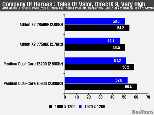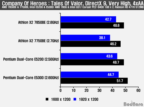 COH : TOV Å×½ºÆ®¿¡¼­´Â °¡Àå ³ôÀº ¿É¼ÇÀ» ¼³Á¤Çϰí 1600 x 1200, 1920 x 1200 ÇØ»óµµ, ±×¸®°í 4xAA¸¦ Àû¿ëÇßÀ» ¶§ÀÇ °á°úµéÀ» ºñ±³Çß´Ù. Å×½ºÆ® °á°ú AA¸¦ Àû¿ëÇÏÁö ¾Ê¾ÒÀ» ¶§ÀÇ °á°ú´Â ÀÎÅÚ º¸±ÞÇü CPU¿ÍÀÇ Á¶ÇÕ¿¡¼­ À¯¸®Çß°í 4xAA¸¦ Àû¿ëÇÒ °æ¿ì ÀÎÅÚ º¸±ÞÇü CPUµéÀÌ ¸¶Âù°¡Áö·Î À¯¸®ÇßÁö¸¸, AA¸¦ Àû¿ëÇÏÁö ¾Ê¾ÒÀ» ¶§º¸´Ù ó¸® ¼º´ÉÀÇ Â÷ÀÌ´Â ´õ Á¼ÇôÁ³´Ù.
