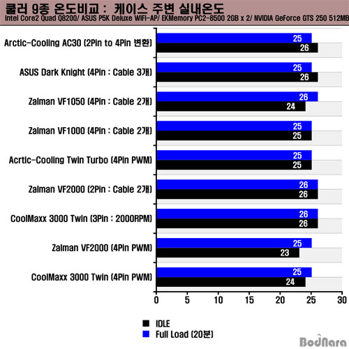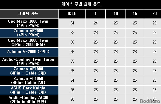 Äð¸Æ½º 3000 Æ®À© 3ÇÉ ¹æ½ÄÀº 3PINÁ¦Ç°ÀÌ 2000RPMÀ¸·Î ÀÛµ¿ÇÏ´Â °ÍÀ¸·Î È®ÀÎµÇ¾î ¾à 4µµ °¡·® ´õ ³·Àº ¿Âµµ¸¦ ±â·ÏÇß´Ù. ASSUS Dark Knightµµ Äð¸Æ½º 3000 Æ®À© 3ÇÉ 2000RPM¿¡ °¡±î¿î ¿Âµµ¸¦ ³ªÅ¸³Â´Ù. ³ª¸ÓÁö Á¦Ç°µéÀÇ °æ¿ì ´ëºÎºÐ 70-73µµ ³»¿ÜÀÇ ¿Âµµ¸¦ ±â·ÏÇß´Ù.