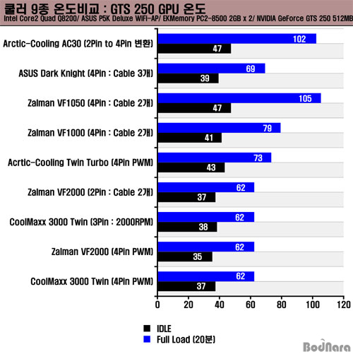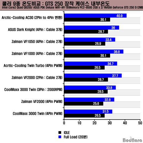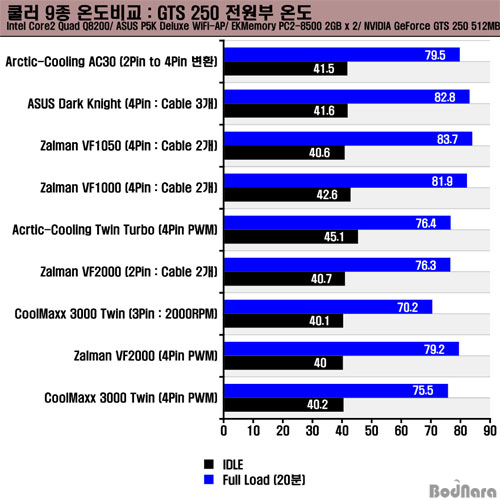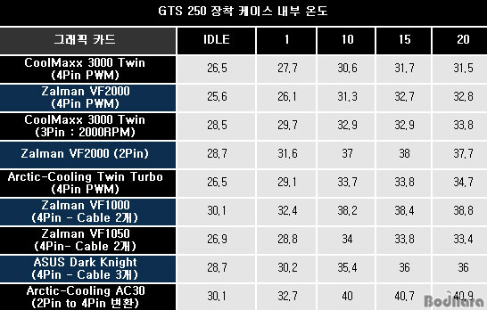 ÁöÆ÷½º GTS 250À» ÄÉÀ̽º¿¡ ³»ÀåÇÑ »óȲ¿¡¼ 20ºÐ°£ ·Îµå¸¦ ÅëÇØ ÃøÁ¤µÈ °á°ú´Â Äð¸Æ½º 3000 Æ®À©°ú À߸¸ VF2000 Äð·¯°¡ °¡Àå ³·Àº 62µµ°¡ ÃøÁ¤µÇ¾úÀ¸¸ç, ´ÙÀ½À¸·Î ASUS Dark Knight°¡ 69µµ, ¾ÆÆ½Ä𸵠ƮÀ©Åͺ¸°¡ 73µµ, À߸¸ VF1000 Äð·¯°¡ 79µµ, ¾ÆÆ½Ä𸵠AC30dl 102µµ, À߸¸ VF1050ÀÌ 105µµ ¼øÀ¸·Î ³ªÅ¸³µ´Ù.