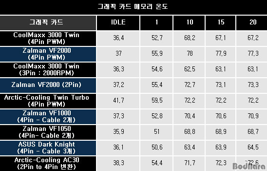 À̹ø¿¡´Â GPU ¿ÜÀÇ ÁÖº¯ºÎ ¿Âµµ·Î º¼ ¼ö ÀÖ´Â Äð·¯ 9Á¾ÀÇ ¸Þ¸ð¸® Àü¿øºÎ ¿Âµµ ºñ±³´Ù. ÁÖº¯ºÎ ¿Âµµ´Â ÀåÂøµÈ Äð·¯ÀÇ ¼ö³ª RPM µî¿¡ ¿µÇâÀ» ¹Þ´Â´Ù°í º¼ ¼ö ÀÖ´Ù. Å×½ºÆ®µÈ °á°ú 2°³ÀÇ Ä𸵠¼Ö·ç¼ÇÀÌ ÀåÂøµÈ COOLMAXX 3000ÀÌ Àü¹ÝÀûÀ¸·Î ¿ì¼öÇß°í À߸¸ VF2000Àº ´Ù¸¥ ºñ±³ Á¦Ç°µéº¸´Ù ºñ±³Àû Å« ÇϳªÀÇ 92mm Å©±âÀÇ Ä𸵠ÆÒÀÌ ÀåÂøµÇ³ª È÷Æ®½ÌÅ©¸¦ °ÅÄ¡¸é¼ ¹æ¿ ´É·ÂÀÌ ¶³¾îÁ® »ó´ëÀûÀ¸·Î ³ôÀº ¿Âµµ¸¦ ±â·ÏÇϰí ÀÖ´Ù.