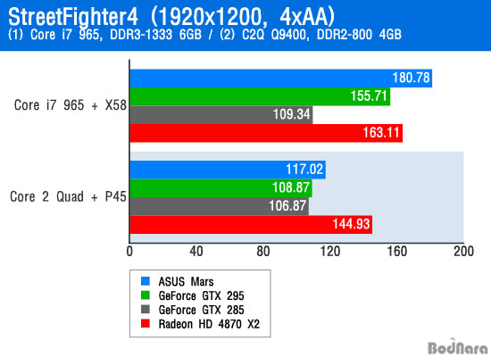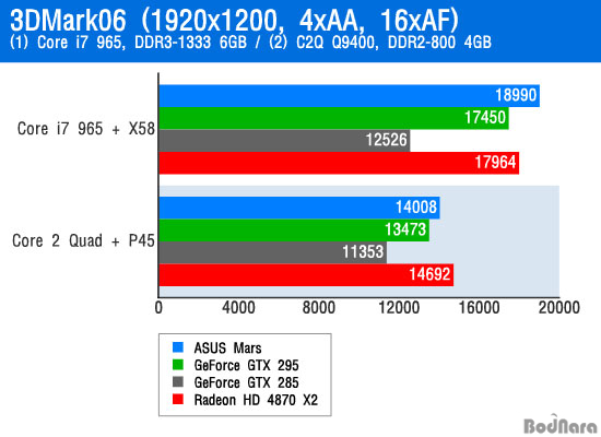 ¹Ý¸é, ÄÚ¾î i7 965 ÀͽºÆ®¸²¿¡ X58 ¸ÞÀκ¸µå, Æ®¸®Çà ä³Î DDR3-1333 ¸Þ¸ð¸®¸¦ »ç¿ëÇÑ °í¼º´É ½Ã½ºÅÛ È¯°æ¿¡¼´Â ½Ì±Û GPU ±×·¡ÇÈ Ä«µå ÃÖ°íºÀ ÁöÆ÷½º GTX 285°¡ °Ü¿ì 1000Á¡ °¡·® Á¡¼ö°¡ ¿Ã¶ó°£ °Í°ú ´Þ¸® µà¾ó GPU ±×·¡ÇÈ Ä«µåÀÇ ¼º´É Çâ»óÀÌ µÎµå·¯Á³´Ù. ƯÈ÷ ASUS Mars´Â ÄÚ¾î 2 Äõµå Q9400 ½Ã½ºÅÛÀÇ ºÎÁøÀ» ¾Ä°í ¶óµ¥¿Â HD 4870 X2º¸´Ù ³ôÀº ¼º´ÉÀ» ±â·ÏÇß´Ù.