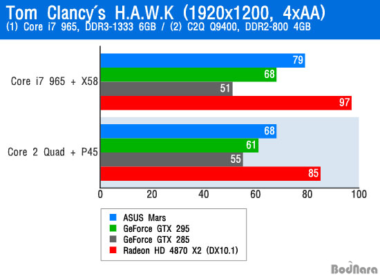¹°·Ð °í»ç¾ç Ç÷§ÆûÀ¸·ÎÀÇ º¯È¿¡ µû¸¥ ¼º´É Çâ»óÀÌ Á¦´ë·Î º¸¿©Áø ¾ÖÇø®ÄÉÀ̼ǰú ´Þ¸® ±×·¸Áö ¸øÇÑ °á°úµµ ÀÖ¾ú´Ù. ATI ¶óµ¥¿Â °è¿¿¡ ÃÖÀûÈµÈ DX10.1 ¸ðµå¸¦ Áö¿øÇÏ´Â H.A.W.K¿¡¼´Â ÁöÆ÷½º °è¿ÀÇ ¼º´É Çâ»óº¸´Ù ¶óµ¥¿Â HD 4870 X2ÀÇ ¼º´É Çâ»óÀÌ ÈξÀ ´õ ÄÇÀ¸¸ç, ½Ì±Û GPU ±×·¡ÇÈ Ä«µå ÁöÆ÷½º GTX 285´Â ÄÚ¾î 2 Äõµå Q9400 ½Ã½ºÅÛÀÏ ¶§º¸´Ù ¿ÀÈ÷·Á ´õ ³·Àº °á°ú°¡ ³ª¿À±âµµ Çß´Ù.