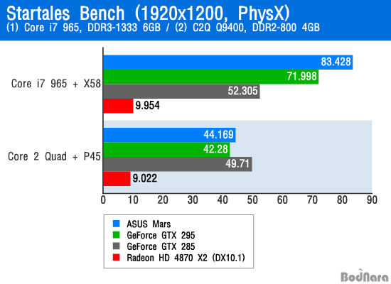 ÇÇÁ÷½º(PhysX) ¿£ÁøÀÌ µé¾î°£ ¿£ºñµð¾Æ Àü¿ë(?) º¥Ä¡ ÇÁ·Î±×·¥ Startales ¿ª½Ã Å×½ºÆ® ½Ã½ºÅÛ¿¡ ¿µÇâÀ» Å©°Ô ¹Þ¾Ò´Ù. ÄÚ¾î 2 Äõµå Q9400 ½Ã½ºÅÛ¿¡¼´Â ½Ì±Û GPU ±×·¡ÇÈ Ä«µåº¸´Ùµµ ³·Àº °á°ú¸¦ º¸¿´Áö¸¸, ÄÚ¾î i7 965 ½Ã½ºÅÛ¿¡¼´Â Á¦´ë·Î µÈ ±×·¡ÇÈ Ä«µå°£ ¼º´É Â÷À̸¦ º¸¿©ÁØ´Ù.