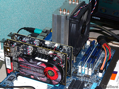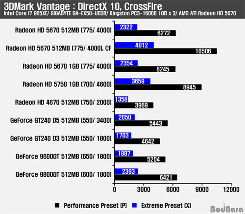 [¶óµ¥¿Â HD 5670 CrossFire] À̹ø¿¡´Â ¶óµ¥¿Â HD 5670ÀÇ ¸ÖƼ GPU ±¸¼ºÀÎ CrossFire ¼º´ÉÀ» »ìÆìº¸±â À§ÇØ ½Ã½ºÅÛÀ» ±¸¼ºÇߴµ¥ ¶óµ¥¿Â HD 5670Àº ¼Ò°³µÈ ·¹ÆÛ·±½º¿Í XFX ¸ðµÎ CrossFire ºê¸´Áö¸¦ Á¦°øÇÏÁö ¾Ê°í ÀÖ¾î PCI-Express x16 ½½·ÔÀ» ÅëÇØ CrossFire ±¸¼ºÀÌ °¡´ÉÇÏ´Ù.  Áï, ³»ºÎ ¼ÒÇÁÆ®¿þ¾î µå¶óÀ̹ö¸¦ ÅëÇØ ±¸¼ºÀÌ °¡´ÉÇϸç, PCI-Express Lane ±¸¼º¿¡ ÀüÀûÀ¸·Î ÀÇÁ¸ÇÔ¿¡ µû¶ó Lane ¼ö¿¡ µû¶ó ºê¸´Áö ±¸¼ºº¸´Ù ´õ Å« ¿µÇâÀ» ¹ÞÀ» °ÍÀ¸·Î º¸¿©Áø´Ù. Å×½ºÆ®µÈ X58Àº PCI-Express 2.0 x16 + x16 Lane ±¸¼ºÀÌ °¡´ÉÇϹǷΠÃÖ±Ù µîÀåÇÑ °í¼º´É Ä«µåµéºÎÅÍ º¸±ÞÇü, Àú°¡Çü±îÁöÀÇ ´ë¿ªÆøÀ» ÃæÁ·ÇÒ ¼ö ÀÖ´Â ±¸¼ºÀÌ´Ù.   3DMark Vantage : DirectX 10