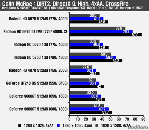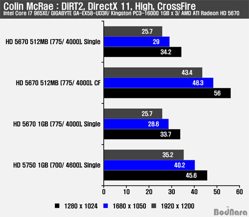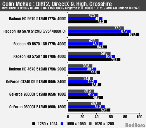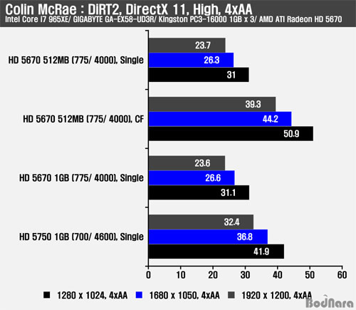 Äݸ° ¸Æ·¹ÀÌ ´õÆ®2¿¡¼ ¶óµ¥¿Â HD 5670 512MB CrossFire ±¸¼ºÀÇ ¼º´ÉÀº Å×½ºÆ®µÈ ½Ì±Û ±×·¡ÇÈÄ«µå Áß °¡Àå ³ôÀº ¼º´ÉÀ» Á¦°øÇÑ ¶óµ¥¿Â HF 5750 1GB¸¦ Å©°Ô ¾Õ¼´Â ³ôÀº Æò±Õ ÇÁ·¹ÀÓÀ» Á¦°øÇϰí ÀÖ´Ù. Äݸ° ¸Æ·¹ÀÌ ´õÆ®2 °ÔÀÓÀÇ °æ¿ì [°ÔÀֺ̹¥Ä¡¸¶Å©] DX11 Àû¿ëÇÑ Äݸ° ¸Æ·¹ÀÌ ´õÆ®2  ±â»ç¿¡¼ Å×½ºÆ®µÈ ½Ã½ºÅÛ°ú ¸Þ¸ð¸® Ŭ·°°ú ŸÀ̹ÖÀ» Á¦¿ÜÇÏ¸é ±âº» ½ºÆåÀº °°´Ù. Å×½ºÆ®µÈ °á°ú´Â 1680 x 1050 66fps, 1920 x 1200 54.65fps, 1920 x 1200 4xAA 45fpsÀÇ Æò±Õ ÇÁ·¹ÀÓÀ» Á¦°øÇߴµ¥ HD 5670 CrossFire ±¸¼ºÀº À̺¸´Ù ³ôÀº 87.7fps/ 77.8/ 67.9fpsÀÇ Æò±Õ ÇÁ·¹ÀÓÀ» Á¦°øÇØ ½Ã½ºÅÛ ±¸¼º°ú µå¶óÀ̹ö ¼º´É Çâ»óÀ» °¨¾ÈÇÏ´õ¶óµµ ²Ï ³ôÀº Çâ»óÀÌ ÀÖ´Ù.   Colin McRae : DiRT2, DirectX 11