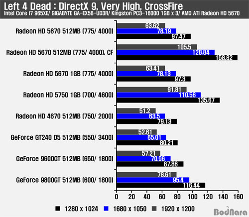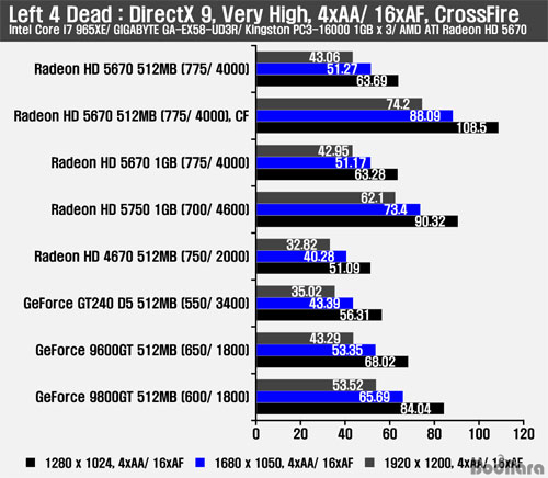 ´õÆ®2 DirectX 11 ȯ°æ¿¡¼ÀÇ ¶óµ¥¿Â HD 5670 CrossFire ±¸¼ºÀÇ ¼º´ÉÀº ¾Õ¼¿Í ¸¶Âù°¡Áö·Î ºñ±³Á¦Ç°µé Áß °¡Àå ³ôÀº Æò±Õ ÇÁ·¹ÀÓÀ» Á¦°øÇß´Ù. ¶óµ¥¿Â HD 5770 1GB´Â Áö³ ´õÆ®2 °ÔÀÌ¹Ö º¥Ä¡¸¶Å©½Ã 1680 x 1050 40.9fps, 1920 x 1200 33.25fps, 1920 x 1200 4xAA 29.95fpsÀÇ °á°ú¸¦ ³ªÅ¸³ÂÀ¸³ª ÀÌ¿Í ¸Þ¸ð¸® Ŭ·°°ú ¸Þ¸ð¸® ŸÀָ̹¸ Â÷À̰¡ ÀÖ´Â À̹ø Å×½ºÆ®¿¡¼´Â 48.3/ 43.4/ 39.3fps¸¦ ±â·ÏÇØ ´õ ³ôÀº Æò±Õ ÇÁ·¹ÀÓÀ» Á¦°øÇÑ´Ù.   Left 4 Dead : DirectX 9, 4xAA/ 16xAF