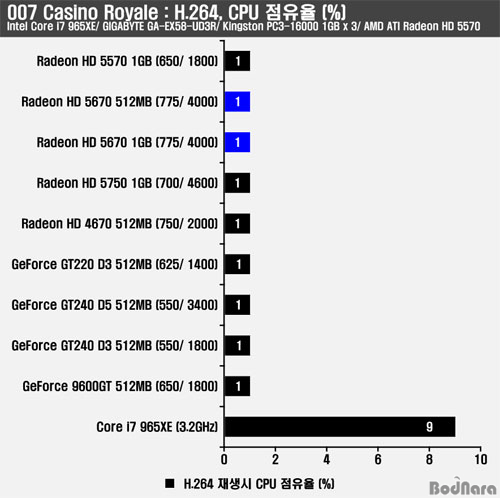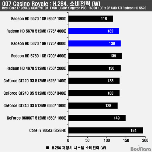 HIS ¶óµ¥¿Â HD 5570 1GB ¹öÀüÀ» ºñ·ÔÇÑ ´ëºÎºÐÀÇ ±×·¡ÇÈÄ«µåµéÀº H.264³ª VC-1 ÄÚµ¦À» Çϵå¿þ¾î °¡¼ÓÇϹǷΠ°í¼º´É CPU¿Í Á¶ÇÕµÉ °æ¿ì CPU Á¡À¯À²À» Å©°Ô ³·Ãâ ¼ö ÀÖ´Ù. ÄÚ¾î i7 965XE (3.2GHz) CPU´Â 9%, ³ª¸ÓÁö GPUµéÀº °í¼º´É CPU¿Í Á¶Çսà H.264 Çϵå¿þ¾î °¡¼ÓÀ» ÅëÇØ 1% ³»¿ÜÀÇ ³·Àº CPU Á¡À¯À²À» Á¦°øÇÑ´Ù.  ¶óµ¥¿Â HD 5570 1GB ¹öÀüÀº ÄÚ¾î 400/ ¸Þ¸ð¸® 1800 (900)MHz°¡ Àû¿ëµÇ°í 50W ÀÌÇÏÀÇ TDP ½ºÆåÀÌ Àû¿ëµÇ´Â ¸¸Å ¶óµ¥¿Â HD 5670º¸´Ù HD ¿µ»ó Àç»ý Áß Á¶±Ý ´õ ³·Àº ¼ÒºñÀü·ÂÀ» Á¦°øÇß´Ù. ÁöÆ÷½º GT220 D3 512MB´Â ·¹ÆÛ·±½ºº¸´Ù ¸Þ¸ð¸® Ŭ·°ÀÌ ³·¾ÆÁ³À¸³ª 2D/ 3D Ŭ·°À» ºñ·ÔÇÏ¿© HD Àç»ý½ÃÀÇ Å¬·°µµ º¯È°¡ ¾ø¾î Àç»ý½Ã Ŭ·°ÀÌ º¯ÈµÇ´Â ÁöÆ÷½º GT240 D5 512MB (405/ ¸Þ¸ð¸® 324/ ½¦ÀÌ´õ 810MHz·Î Ç϶ô)¿Í °°Àº ¼ÒºñÀü·ÂÀÌ ³ªÅ¸³µ´Ù. Ŭ·°¿¡ º¯È°¡ ¾ø´Â ÁöÆ÷½º GT220 D3 512MB´Â Ŭ·°¿¡ º¯È°¡ ¾ø¾î HD ¿µ»ó Àç»ý½Ã ÄÚ¾î 400/ ¸Þ¸ð¸® 3600 (900)MHz·Î Á¶ÀýµÇ´Â ¶óµ¥¿Â HD 5670 512MBº¸´Ù 1W °¡·® ´õ ³ô°Ô ÃøÁ¤µÇ¾ú´Ù.     ±×·¡ÇÈÄ«µå ¿Âµµºñ±³