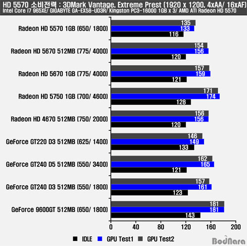 HIS ¶óµ¥¿Â HD 5570 1GB ¹öÀüÀ» ºñ·ÔÇÑ ±×·¡ÇÇÄ«µåµéÀÇ ¼ÒºñÀü·Â ÃøÁ¤Àº Àüü ½Ã½ºÅÛÀ» ±âÁØÀ¸·Î ÃøÁ¤µÇ¸ç, 3DMark Vantage Extreme Preset (1920 x 1200, 4xAA/ 16xAF)ÀÇ GPU Test1°ú GPU Test2 ÁøÇà½Ã °¡Àå ³ôÀº ¼ÒºñÀü·ÂÀ» ºñ±³Çß´Ù. HIS ¶óµ¥¿Â HD 5570 1GB ¹öÀüÀº ¾ÆÀ̵é½Ã ÄÚ¾î 157/ ¸Þ¸ð¸® 400 (200)MHz, ¶óµ¥¿Â HD 5670/ 5750Àº ¾ÆÀ̵é½Ã ÄÚ¾î 157/ ¸Þ¸ð¸® 1200 (300)MHz, ÁöÆ÷½º GT240Àº ÄÚ¾î 135/ ¸Þ¸ð¸® 135/ ½¦ÀÌ´õ 270MHz,  ÁöÆ÷½º 9600GT´Â ÄÚ¾î 650/ ¸Þ¸ð¸® 1800/ ½¦ÀÌ´õ 1625MHz·Î Ŭ·°ÀÌ °íÁ¤µÇ¾î ¾ÆÀ̵é½ÃÀÇ ¼ÒºñÀü·ÂÀº ÀÌ¿¡ µû¶ó ´Þ¶óÁø´Ù. ¶Ç, ¶óµ¥¿Â HD 5570 ·¹ÆÛ·±½º´Â ·Îµå½Ã 50W ³»¿ÜÀÇ TDP, ¶óµ¥¿Â HD 5670Àº ¾ÆÀ̵é½Ã 14W/ ·Îµå½Ã 61W TDP, HD 5750Àº 16W/ 86W TDPÀÇ ½ºÆåÀ» Á¦°øÇϸç, HD 4670Àº 59W, ÁöÆ÷½º GT240Àº ¾ÆÀ̵é 9W/ ·Îµå½Ã 69W TDP, 9600GT´Â 65nm·Î 96W TDP ½ºÆåÀ» °¡Áø´Ù. HIS ¶óµ¥¿Â HD 5570 1GB ¹öÀüÀº °æÀï Á¦Ç°°ú »óÀ§ Á¦Ç°µéº¸´Ù Àü¹ÝÀûÀ¸·Î ¼ÒºñÀü·ÂÀÌ ³·¾ÒÀ¸¸ç, ÁöÆ÷½º GT220 D3 512MB´Â ¾ÆÀ̵é½Ã Ŭ·°ÀÌ °íÁ¤µÇ¾î ´Ù¸¥ Á¦Ç°µéº¸´Ù ³ôÀ¸³ª ·Îµå½Ã´Â ¶óµ¥¿Â HD 4670À̳ª ÁöÆ÷½º GT240 D3/ D5 512MBº¸´Ù ³·Àº ¼ÒºñÀü·ÂÀ» Á¦°øÇÑ´Ù. |