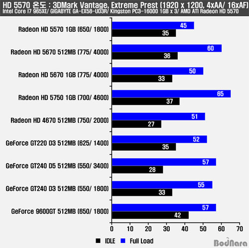 ±×·¡ÇÈÄ«µå ¿Âµµ´Â GPU-Z 0.3.8¹öÀüÀ» ÀÌ¿ëÇÏ¿© Å×½ºÆ®¸¦ ÁøÇàÇß´Ù. ¶óµ¥¿Â HD 5670 512MB´Â ·¹ÆÛ·±½º Ä𸵼ַç¼Ç, 1GB´Â ¾ÆÆ½Ä𸵠(Arctic Cooling)»çÀÇ Accelero L2 Pro Äð·¯, HD 4670Àº ·¹ÆÛ·±½º Ä𸵼ַç¼Ç, HD 5750Àº ·¹ÆÛ·±½º, ÁöÆ÷½º 9600GT´Â À߸¸ VF700-AlCu Äð·¯, HIS ¶óµ¥¿Â HD 5570 1GB´Â ·¹ÆÛ·±½º¿Í À¯»çÇÑ Ä𸵠¼Ö·ç¼Ç, ÁöÆ÷½º GT220 D3 512MB´Â Äð·¯ + È÷Æ®½ÌÅ©°¡ »ç¿ëµÈ Ä𸵼ַç¼ÇÀÌ »ç¿ëµÈ´Ù. ¶óµ¥¿Â HD 5570Àº ¾ÆÀ̵é½Ã ÄÚ¾î 157/ ¸Þ¸ð¸® 400 (200)MHz, ¶óµ¥¿Â HD 5670/ 5750Àº ¾ÆÀ̵é½Ã ÄÚ¾î 157/ ¸Þ¸ð¸® 1200 (300)MHz, ÁöÆ÷½º GT240Àº ÄÚ¾î 135/ ¸Þ¸ð¸® 135/ ½¦ÀÌ´õ 270MHz,  ÁöÆ÷½º 9600GT´Â ÄÚ¾î 650/ ¸Þ¸ð¸® 1800/ ½¦ÀÌ´õ 1625MHz·Î Ŭ·°ÀÌ °íÁ¤µÈ´Ù.    HIS ¶óµ¥¿Â HD 5570 1GB ¹öÀüÀº LPŸÀÔÀ¸·Î ÀÛÀº Ä𸵠¼Ö·ç¼Ç Àû¿ëµÇ³ª ¿Âµµ´Â ÁöÆ÷½º GT220 D3 512MB¸¦ ºñ·ÔÇÑ ´Ù¸¥ Á¦Ç°µéº¸´Ù Àü¹ÝÀûÀ¸·Î ³·Àº ¿Âµµ¸¦ ±â·ÏÇß´Ù.     HD 5570 ½Ã½ºÅÛ ¼ÒºñÀü·Âºñ±³