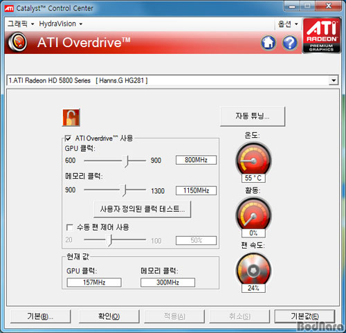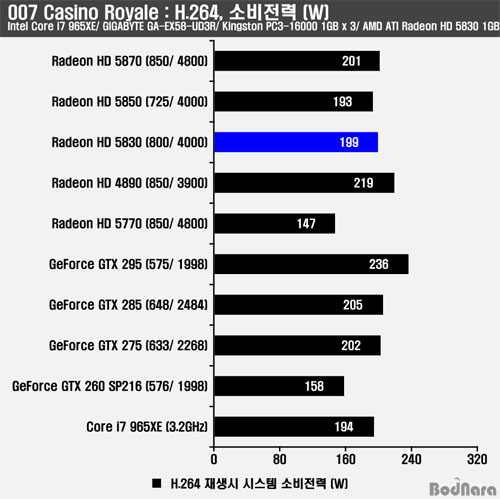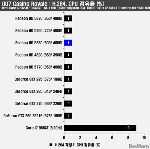[HD 5830, ¾ÆÀ̵é½Ã ÄÚ¾î 157/ ¸Þ¸ð¸® 1200 (300)MHz·Î µ¿ÀÛ] ¶óµ¥¿Â HD 5830 (Radeon HD 5830)Àº ¶óµ¥¿Â HD 5870/ 5850 ½Ã¸®Áî¿Í °°ÀÌ Çâ»óµÈ Àü·Â°ü¸® ±â´É¿¡ µû¶ó °³¼±µÈ ATI PowerPlay, ºÎÇÏ¿¡ µû¶ó ½ºÀ§Äª °¡´ÉÇØÁø GDDR5 ¸Þ¸ð¸®¸¦ ¹ÙÅÁÀ¸·Î ÀÌÀüº¸´Ù Àü·ÂÈ¿À²ÀÌ ³ô¾ÆÁ³´Ù. ¶óµ¥¿Â HD 5830ÀÇ ·¹ÆÛ·±½º Ŭ·°Àº ÄÚ¾î 800/ ¸Þ¸ð¸® 4000 (1000)MHzÀÌÁö¸¸, Å×½ºÆ®·Î Á¦°øµÈ ·¹ÆÛ·±½º »ùÇà ¹öÀüÀº ¸Þ¸ð¸® Ŭ·°ÀÌ 4600 (1150)MHz·Î ¼³Á¤µÇ¾îÀÖ´Ù.     1080p H.264 ¿µ»ó Àç»ý½Ã CPU Á¡À¯À² ¹× ½Ã½ºÅÛ ¼ÒºñÀü·Â