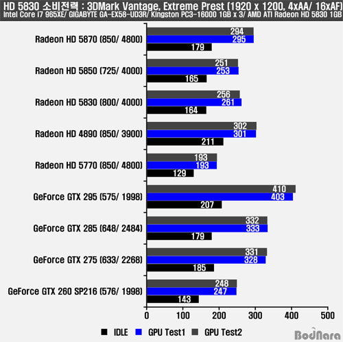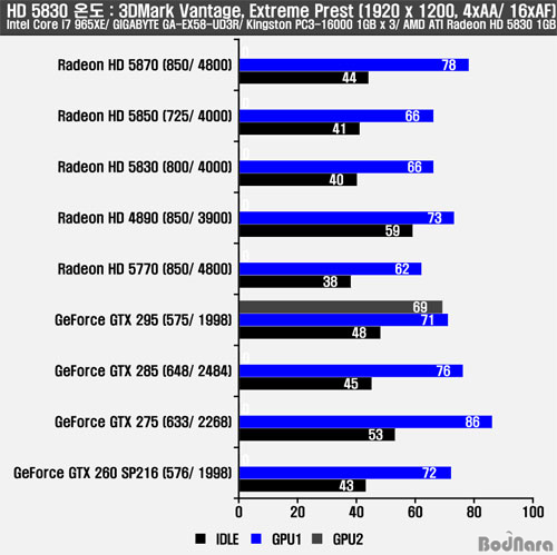 HD 5830/ HD 5870/ HD 5850/ HD 5770Àº ¾ÆÀ̵é½Ã ÄÚ¾î 157/ 1200 (300)MHz·Î ³·¾ÆÁö°í À̶§ Àü¾Ðµµ °°ÀÌ ³·¾ÆÁ® ¿Âµµ¿¡µµ Â÷À̸¦ º¸ÀδÙ. GTX 295´Â ½Ì±Û PCB¿¡ µÎ °³ÀÇ GPU°¡ ÀåÂøµÈ ¹öÀüÀ¸·Î GPU-Z¿¡ ¿Âµµ°¡ ÃøÁ¤µÇÁö ¾Ê¾Æ Everest V5.02.1850beta ¹öÀüÀ¸·Î ÃøÁ¤µÈ ¿Âµµ¸¦, ³ª¸ÓÁö´Â GPU-Z 0.3.5/ 0.3.9·Î ÃøÁ¤µÈ ¿Âµµ¸¦ ºñ±³Çß´Ù. ¿Âµµ´Â 3DMark Vantage Extreme Prest (1920 x 1200, 4xAA/ 16xAF)¸¦ Å×½ºÆ®ÇÏ´Â µµÁß °¡Àå ³ôÀº ¿Âµµ¸¦ ºñ±³Çß´Ù. ¿Âµµ Å×½ºÆ® °á°ú HD 5830Àº ¾ÆÀ̵é½Ã ÄÚ¾î¿Í ¸Þ¸ð¸® Ŭ·°ÀÌ Å©°Ô ³·¾ÆÁö°í 40nm °øÁ¤ÀÌ Àû¿ëµÇ¾î ¶óµ¥¿Â HD 4890º¸´Ù ³·Àº ¿Âµµ¸¦ ±â·ÏÇϰí ÀÖ´Ù. »óÀ§ Á¦Ç°ÀÎ ¶óµ¥¿Â HD 5850°ú´Â ¾ÆÀ̵é½Ã 1µµ ³·°í Ç®·Îµå´Â 66µµ·Î Â÷À̾ø°Ô ÃøÁ¤µÇ¾ú´Ù.     HD 5830 ½Ã½ºÅÛ ¼ÒºñÀü·Âºñ±³