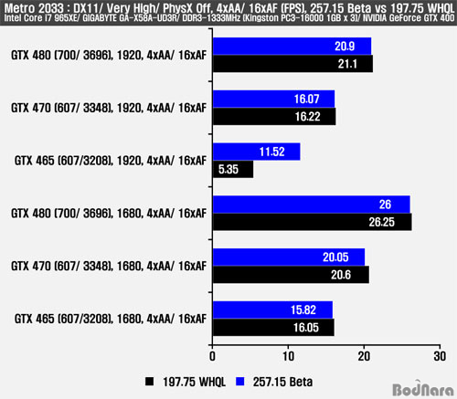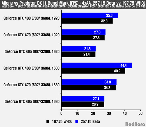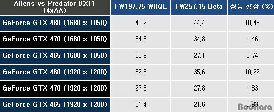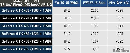 7. DX11, 197.75 WHQL vs 257.15 Beta (2)  DirectX 11 ȯ°æ¿¡¼ÀÇ AA/ AF¸¦ Àû¿ëÇÏÁö ¾ÊÀº °á°ú¿¡ À̾î À̹ø¿¡´Â AA/ AF¸¦ Àû¿ëÇÏ¿´À» ¶§ÀÇ 256 µå¶óÀ̹ö ¹× 197 µå¶óÀ̹öÀÇ ¼º´É Çâ»óÀ» È®ÀÎÇØ º¸¾Ò´Ù.   DX11 ȯ°æÀÇ ¼º´É (4xAA ¶Ç´Â 4xAA/ 16xAF)