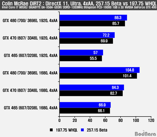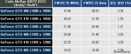 Äݸ° ¸Æ·¹ÀÌ ´õÆ®2 (Colin McRae DiRT2)ÀÇ 4xAA/ 16xAF Àû¿ë½Ã ¼º´É Çâ»óÀº 1680 x 1050 ÇØ»óµµ´Â ÁöÆ÷½º GTX 480ÀÌ, 1920 x 1200 ÇØ»óµµ´Â ÁöÆ÷½º GTX 470ÀÇ Çâ»óÀÌ ³ô°Ô ³ªÅ¸³µ´Ù. Àü¹ÝÀûÀÎ Çâ»óÀº 4% ³»¿Ü·Î È®ÀεȴÙ.