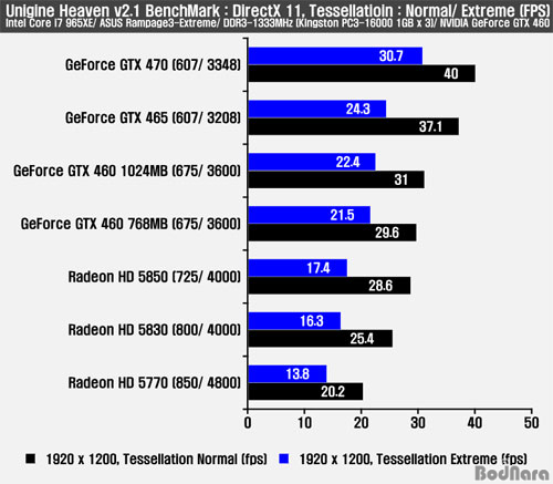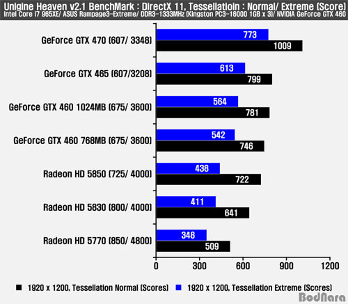 Å×¼¿·¹ÀÌ¼Ç ºÎÇÏ ¼³Á¤°ú OpenGL 4.0°ú Å×¼¿·¹À̼Ç, ±×¸®°í ½ºÅ×·¹¿À 3D¸¦ Áö¿øÇÏ°Ô µÈ Unigine Heaven 2.1 º¥Ä¡¸¶Å©´Â ´Ù¸¥ º¥Ä¡¸¶Å© ÇÁ·Î±×·¥ ¹× °ÔÀӵ麸´Ù Å×¼¿·¹ÀÌ¼Ç È¿°ú¿Í Â÷À̸¦ ºñ±³Àû ±Ø¸íÇÏ°Ô º¸¿©ÁÙ ¼ö ÀÖ´Ù. ÁöÆ÷½º GTX 460 ½Ã¸®Áî´Â Å×¼¿·¹ÀÌÅÍ ¼ö ¹× ·¡½ºÅͶóÀÌÀú µîÀÇ ±¸¼ºÀÇ Â÷ÀÌ¿¡ ÀÇÇØ ÁöÆ÷½º GTX 465º¸´Ù ³·Àº ÇÁ·¹ÀÓ°ú ½ºÄھ Á¦°øÇϸç, ¶óµ¥¿Â HD 5800 ½Ã¸®Á´Ù Àü¹ÝÀûÀ¸·Î ¾Õ¼±´Ù.