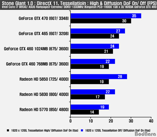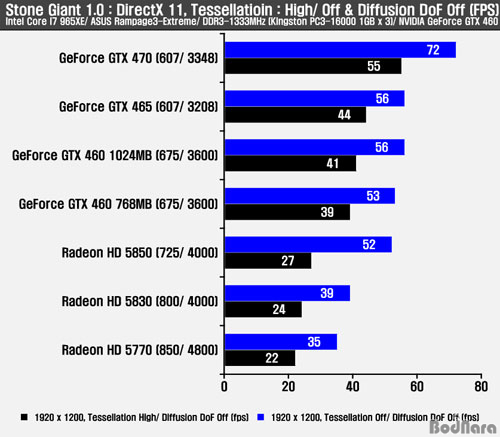 Å×¼¿·¹À̼ǰú DirectX 11À» Áö¿øÇÏ´Â ½ºÅæ ÀÚÀÌ¾ðÆ® º¥Ä¡¸¶Æ®ÀÇ °á°ú´Â ¿£ºñµð¾Æ (NVIDIA) ÁöÆ÷½º GTX 400 ½Ã¸®ÁîµéÀÌ DirectX 11°ú DoF, Å×¼¿·¹ÀÌ¼Ç Àû¿ë½Ã Àü¹ÝÀûÀ¸·Î ¿ì¼öÇÑ ÇÁ·¹ÀÓÀ» Á¦°øÇß´Ù. ÁöÆ÷½º GTX 460 768MB´Â Å×¼¿·¹À̼Ǹ¸ Ȱ¼ºÈÇÒ °æ¿ì ¶óµ¥¿Â HD 5850À» ¾Õ¼¹°í ºÎÇϰ¡ °É¸®´Â Å×¼¿·¹À̼ǰú DoF Á¶ÇÕ¿¡¼´Â ¶óµ¥¿Â HD 5850°ú °°Àº ÇÁ·¹ÀÓÀ» Á¦°øÇß´Ù. 1GB´Â ¶óµ¥¿Â HD 5850º¸´Ù Å©°Ô ³ôÁö ¾ÊÀ¸³ª Á¶±Ý ´õ ³ôÀº ÇÁ·¹ÀÓÀ» Á¦°øÇß´Ù. ÁöÆ÷½º GTX 460 ½Ã¸®Áî´Â ÁöÆ÷½º GTX 465º¸´Ù Å×¼¿·¹ÀÌ¼Ç ¼ö¿Í ·¡½ºÅͶóÀÌÀú ±¸¼º µîÀÇ Â÷ÀÌ·Î ´Ù¸¥ °ÔÀӵ鿡¼ÀÇ °á°ú¿Í ´Þ¸® Å×¼¿·¹ÀÌ¼Ç Àû¿ë¿¡ µû¸¥ Â÷À̸¦ Á¦´ë·Î ³ªÅ¸³»Áá´Ù.