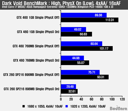 ´ÙÅ©º¸À̵å (Dark Void) º¥Ä¡¸¶Å© Å×½ºÆ®¿¡¼ PhysX High ¼³Á¤ Áï, GPU PhysX °¡¼Ó°ú PhysX¸¦ »ç¿ëÇÏÁö ¾Ê´Â Off »óÅÂÀÏ ¶§ÀÇ Å×½ºÆ® °á°ú´Â ÁöÆ÷½º GTX 460 768MB´Â GTX 260 ´ëºñ 1680/ 1920 ÇØ»óµµ (89.10%/ 83.56%), 1GB (1024MB)´Â 1680/ 1920 (98.01%/ 92.57%)°¡ Çâ»óµÇ¾ú´Ù. PhysX¸¦ ÄѰí 4xAA¸¦ Àû¿ëÇÒ °æ¿ì GTX 460 768MB´Â GTX 260 ´ëºñ 1680/ 1920 ÇØ»óµµ (68.87%/ 52.58%)¿¡¼ Çâ»óµÇ¾ú°í 1GB´Â 1680/ 1920 ÇØ»óµµ¿¡¼ (86.54%/ 66.28%)°¡ Çâ»óµÇ¾ú´Ù.