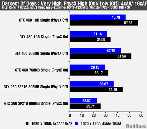 Darkest Of Days Å×½ºÆ®¿¡¼ PhysX High ¼³Á¤ Áï, GPU PhysX °¡¼Ó°ú PhysX¸¦ »ç¿ëÇÏÁö ¾Ê´Â Off »óÅÂÀÏ ¶§ÀÇ Å×½ºÆ® °á°ú´Â ÁöÆ÷½º GTX 460 768MB´Â GTX 260 ´ëºñ 1680/ 1920 ÇØ»óµµ (23.46%/ 18.34%), 1GB (1024MB)´Â 1680/ 1920 (24.59%/ 27.71%)°¡ Çâ»óµÇ¾ú´Ù. PhysX¸¦ ÄѰí 4xAA¸¦ Àû¿ëÇÒ °æ¿ì GTX 460 768MB´Â GTX 260 ´ëºñ 1680/ 1920 ÇØ»óµµ (24.98%/ 29.44%)¿¡¼ Çâ»óµÇ¾ú°í 1GB´Â 1680/ 1920 ÇØ»óµµ¿¡¼ (32.32%/ 38.28%)°¡ Çâ»óµÇ¾ú´Ù.