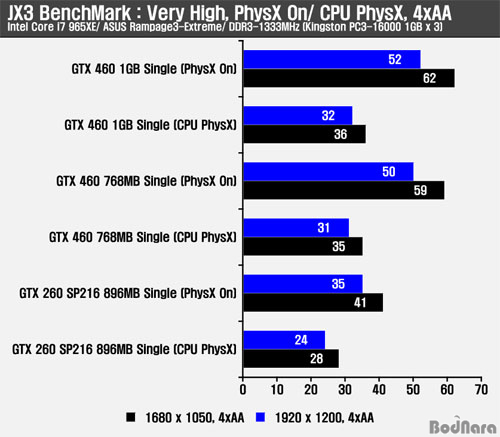 JX3 º¥Ä¡¸¶Å© Å×½ºÆ®¿¡¼ PhysX High ¼³Á¤ Áï, GPU PhysX °¡¼Ó°ú PhysX¸¦ »ç¿ëÇÏÁö ¾Ê´Â Off »óÅÂÀÏ ¶§ÀÇ Å×½ºÆ® °á°ú´Â ÁöÆ÷½º GTX 460 768MB´Â GTX 260 ´ëºñ 1680/ 1920 ÇØ»óµµ (32.65%/ 30.95%), 1GB (1024MB)´Â 1680/ 1920 (34.69%/ 35.71%)°¡ Çâ»óµÇ¾ú´Ù. PhysX¸¦ ÄѰí 4xAA¸¦ Àû¿ëÇÒ °æ¿ì GTX 460 768MB´Â GTX 260 ´ëºñ 1680/ 1920 ÇØ»óµµ (43.90%/ 42.86%)¿¡¼ Çâ»óµÇ¾ú°í 1GB´Â 1680/ 1920 ÇØ»óµµ¿¡¼ (51.22%/ 48.57%)°¡ Çâ»óµÇ¾ú´Ù. JX3 º¥Ä¡¸¶Å©´Â GPU PhysX¿Í CPU PhysX Å×½ºÆ®¸¸ °¡´ÉÇØ PhysX¸¦ ²°À» ¶§ÀÇ °á°ú¸¦ ºñ±³ÇÏÁö ¸øÇß´Ù.