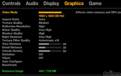 Å×½ºÆ®ÇÑ °¢ ÇØ»óµµ ¸ðµÎ ÅØ½ºÃ³ Ä÷¸®Æ¼´Â Medium, Reflection Resoltion¿Í Shadow Quality´Â High, View Distance´Â 45, Detail Distance´Â 30, Vehicle Density´Â 50À¸·Î ¼³Á¤Çß´Ù. ¶ÇÇÑ, 1920x1200 ÇØ»óµµ¿¡¼´Â Water Quality¿Í Night Shadows¸¦ Very High·Î, AF x16À» ¼³Á¤Çϰí, 1680x1050 ÇØ»óµµ¿¡¼´Â Water Quality¿Í Night Shadows¸¦ High·Î, AF x2·Î ¼³Á¤ ÈÄ, GTA4ÀÇ ¿ÀÅä¹ÙÀÌ ÃѰݽŠº¥Ä¡¸¶Å©¸¦ ÀÌ¿ëÇØ Å×½ºÆ®Çß´Ù. (È®ÀåÆÑ ¹Ì Àû¿ë)