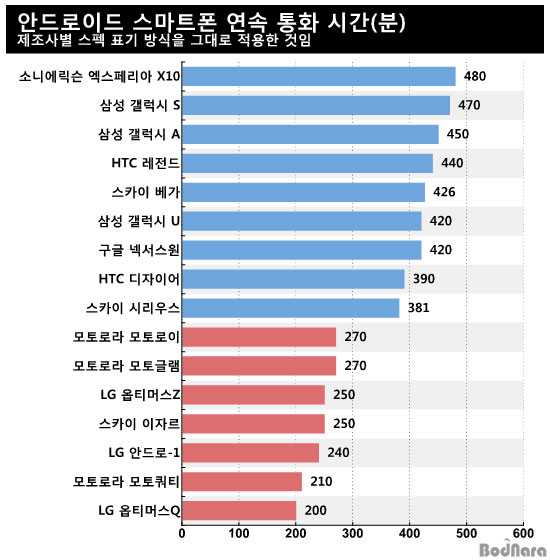 ´ë´Ù¼öÀÇ ¾Èµå·ÎÀ̵åÆùÀÌ ´Ù¾çÇÑ È¯°æ¿¡¼ÀÇ ¹èÅ͸® »ç¿ë ½Ã°£À» Ç¥½ÃÇÏÁö ¾Ê´Â´Ù. ´ë½Å ¹èÅ͸® ¿ë·®°ú 3G ȯ°æ¿¡¼ÀÇ ¿¬¼Ó ÅëÈ ½Ã°£, ¿¬¼Ó ´ë±â ½Ã°£À» ±âÁØÀ¸·Î ¹èÅ͸® ½ºÆåÀ» Ç¥±âÇϰí ÀÖ´Ù.