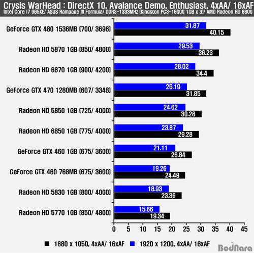 ±×·¡ÇȿɼÇÀ» Enthusiast·Î ¼³Á¤Çϰí 4xAA/ 16xAF¸¦ Àû¿ëÇØ ºÎÇϸ¦ ´Ã¸®¸é, ¶óµ¥¿Â HD 6870Àº HD 5870¿¡´Â ³·Àº ÇÁ·¹ÀÓÀ» Á¦°øÇϳª ÁöÆ÷½º GTX 470¿¡´Â ¾Õ¼´Â ÇÁ·¹ÀÓÀ» Á¦°øÇß´Ù. HD 6850Àº HD 5850¿¡´Â ¾à°£ ¸ø¹ÌÄ¡´Â ¼º´ÉÀ» ³»Áá°í °æÀï Á¦Ç°ÀÎ ÁöÆ÷½º GTX 460 ½Ã¸®Á´Ù ³ôÀº ÇÁ·¹ÀÓÀ» Á¦°øÇÏ´Â °ÍÀ¸·Î È®ÀεȴÙ. ÀÌ´Â ¶óµ¥¿Â HD 6800 ½Ã¸®Áî°¡ ¸Þ¸ð¸® 256bit ¸Þ¸ð¸® ÀÎÅÍÆäÀ̽º¿Í ³ôÀº ¸Þ¸ð¸® Ŭ·°À» ¹ÙÅÁÀ¸·Î ¸Þ¸ð¸® ´ë¿ªÆø Áõ°¡¿Í 32 ROP¸¦ Á¦°øÇØ °íÇØ»óµµ¿Í AA/ AF ȯ°æ¿¡¼ À¯¸®ÇØÁø °ÍÀÌ´Ù.