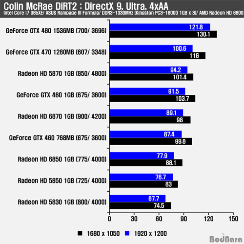 Äݸ° ¸Æ·¹ÀÌ ´õÆ®2 °ÔÀÓ¿¡ AA/ AF¸¦ Àû¿ëÇÑ °á°ú ¶óµ¥¿Â HD 6870Àº ÁöÆ÷½º GTX 460 1GB¿¡ ¶³¾îÁö´Â ÇÁ·¹ÀÓÀ» Á¦°øÇß°í HD 5870°ú ÁöÆ÷½º GTX 470°úµµ ²Ï Å« Â÷À̸¦ ³ªÅ¸³Â´Ù. HD 6850Àº °æÀïÀÌ µÇ´Â ÁöÆ÷½º GTX 460 768MB¿Í ºñ±³ÇØ °íÇØ»óµµ¿Í ÀúÇØ»óµµ ¸ðµÎ ´õ ³·Àº ÇÁ·¹ÀÓÀ» Á¦°øÇß°í ¶óµ¥¿Â HD 5850¿¡´Â ±Ù¼ÒÇÏ°Ô ¾Õ¼´Â ¸ð½ÀÀ» º¸¿©ÁØ´Ù.