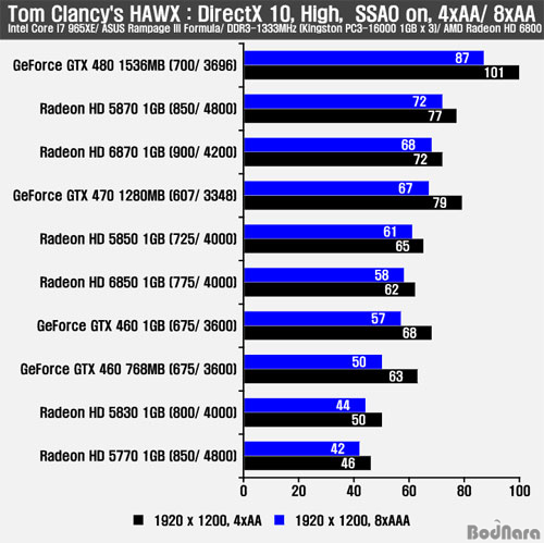 HAWX´Â ¶óµ¥¿Â HD 5870¿¡´Â °íÇØ»óµµ¿¡¼ º¸´Ù ±ÙÁ¢ÇØÁ³À¸¸ç, ÁöÆ÷½º GTX 470¿¡´Â ÀúÇØ»óµµ¿¡¼´Â ¹Ð·ÈÀ¸³ª °íÇØ»óµµ¿¡¼´Â ¾à°£ ³ôÀº ÇÁ·¹ÀÓÀ» Á¦°øÇß´Ù. ¶óµ¥¿Â HD 6850Àº HD 5850¿¡´Â ¾à°£ ³·Àº ÇÁ·¹ÀÓÀ», ÁöÆ÷½º GTX 460 ½Ã¸®Áî¿¡´Â ÀúÇØ»óµµ¿¡¼´Â ³·Àº ÇÁ·¹ÀÓÀ» Á¦°øÇßÀ¸³ª °íÇØ»óµµ¿¡¼ ¿ªÀüÇÏ´Â ¸ð½ÀÀ» º¸¿©ÁØ´Ù.