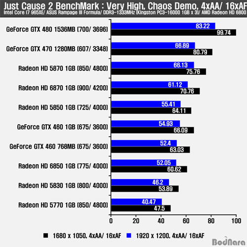 Just Cause2¿¡ 4xAA/ 16xAF¸¦ Àû¿ëÇÒ °æ¿ì ¶óµ¥¿Â HD 6870Àº ÁöÆ÷½º GTX 470°ú HD 5870º¸´Ù ³·Àº ÇÁ·¹ÀÓÀ» Á¦°øÇÏ´Â °ÍÀ¸·Î È®ÀεǸç, HD 6850Àº ÁöÆ÷½º GTX 460 768MB¿¡´Â ±ÙÁ¢Çϳª ³·Àº ÇÁ·¹ÀÓÀ» ÁöÆ÷½º GTX 460 1GB¿¡´Â ±× Â÷À̰¡ ´õ Ä¿Áø´Ù.