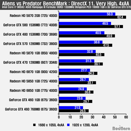 DirectX 11 Áö¿ø Aliens vs Predator´Â DirectX 11°ú Å×¼¿·¹À̼ÇÀ» Àû¿ëÇÑ º¥Ä¡¸¶Å©·Î AA ¹ÌÀû¿ë½Ã ÁöÆ÷½º 400 ½Ã¸®Áî¿Í ÁöÆ÷½º 500 ½Ã¸®Á´Ù ¶óµ¥¿Â HD 5800/ 6800 ½Ã¸®Áî¿¡ º¸´Ù ÃÖÀûÈµÈ ¸ð½ÀÀ» º¸¿©ÁØ´Ù. ÁöÆ÷½º GTX 570Àº AA ¹ÌÀû¿ë½Ã¿¡´Â ±Ù¼ÒÇÏ°Ô ÁöÆ÷½º GTX 480À» ¾Õ¼¹°í AA Àû¿ë½Ã¿¡´Â ¿ÀÈ÷·Á ¾à°£ ³·Àº ÇÁ·¹ÀÓÀ» Á¦°øÇϴµ¥ ÀÌ´Â ROP ¼ö¿Í ¸Þ¸ð¸® ÀÎÅÍÆäÀ̽º, ¸Þ¸ð¸® ´ë¿ªÆøÀÇ ¿µÇâÀ¸·Î º¼ ¼ö ÀÖ´Ù.