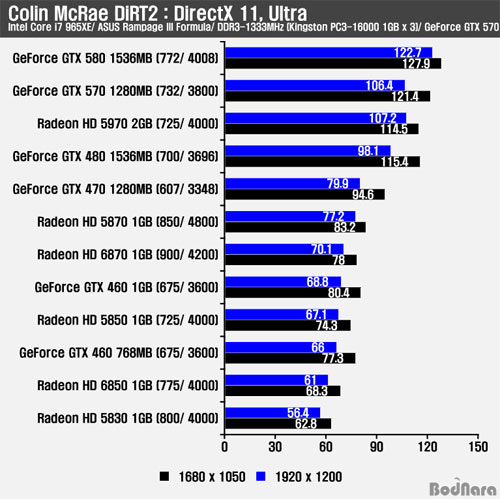 Äݸ° ¸Æ·¹ÀÌ ´õÆ®2 (Colin McRae DiRT2)´Â DirectX 9 ȯ°æ¿¡¼¿Í ´Þ¸® DirectX 11 ȯ°æ¿¡¼´Â AA/ AF¸¦ Àû¿ëÇÒ ¶§¿Í Àû¿ëÇÏÁö ¾ÊÀ» ¶§ ¸ðµÎ ÁöÆ÷½º GTX 570ÀÌ ÁöÆ÷½º GTX 480À» ¾Õ¼´Â ÇÁ·¹ÀÓÀ» Á¦°øÇß´Ù. DirectX 11 ȯ°æ°ú Å×¼¿·¹À̼ÇÀÌ Àû¿ëµÈ »óȲ¿¡¼ ÁöÆ÷½º GTX 500 ½Ã¸®Áî´Â ÁöÆ÷½º 400 ½Ã¸®Áî¿¡ À̾î Àü¹ÝÀûÀ¸·Î ¿ì¼öÇÑ ¸ð½ÀÀ» º¸¿©ÁÖ°í ÀÖ´Ù.