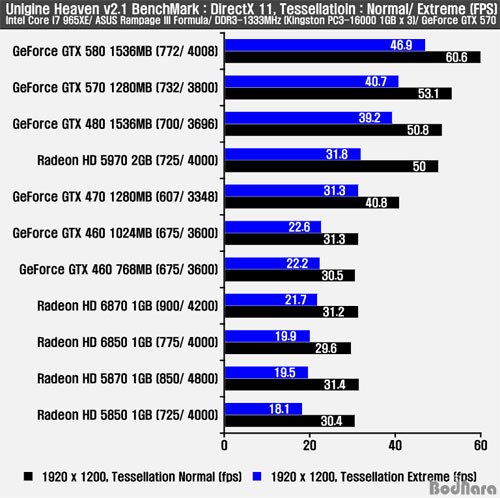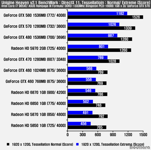 DX11°ú Å×¼¿·¹ÀÌ¼Ç À¯´ÖÀÇ Ã³¸® È¿À²°ú ¼º´ÉÀº Àü¹ÝÀûÀ¸·Î ÁöÆ÷½º 400 ½Ã¸®Á ÀÕ´Â ÁöÆ÷½º 500 ½Ã¸®Áîµµ °æÀï»ç ´ëºñ ¿ì¼öÇÑ ¸ð½ÀÀ» º¸¿©ÁÖ°í ÀÖ´Ù. ±×·¯³ª, °æÀï»ç ¿ª½Ã ¶óµ¥¿Â HD 6800 ½Ã¸®Áî¿Í ¾ÕÀ¸·Î µîÀ忹Á¤ÀÎ ¶óµ¥¿Â HD 6900 ½Ã¸®Áî¿¡¼´Â Å×¼¿·¹ÀÌ¼Ç Ã³¸® ¼º´ÉÀ» °³¼±ÇÒ °ÍÀ¸·Î ¾Ë·ÁÁ® ÀÖ¾î DX11°ú Å×¼¿·¹ÀÌ¼Ç Ã³¸® ¼º´ÉÀÌ Á¶±ÝÀº ´õ Á¼ÇôÁú °ÍÀ¸·Î ¿¹»óµÈ´Ù. ÁöÆ÷½º GTX 570Àº ÁöÆ÷½º GTX 480À» ÀÌ¾î °æÀï»ç´ëºñ À¯¸®ÇÑ ¼º´ÉÀ» Á¦°øÇß´Ù.