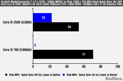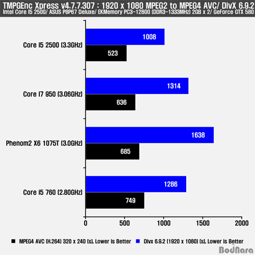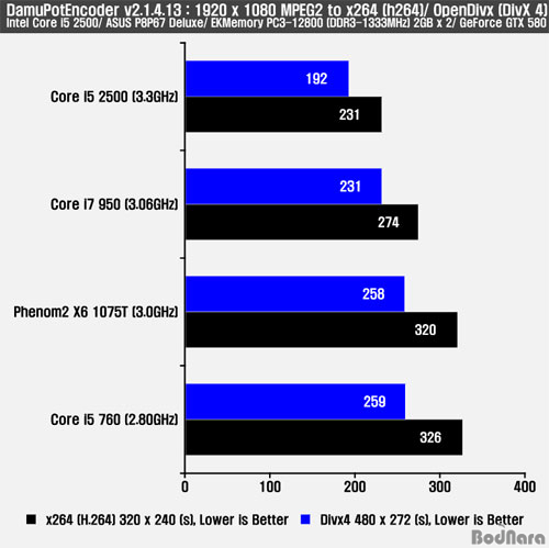 ÀÎÄÚµù ó¸® ¼º´É ¿ª½Ã CPU¿Í Àüü ½Ã½ºÅÛÀÇ ¼º´ÉÀ» ¹Ý¿µÇϰí Àִµ¥ »÷µðºê¸´Áö ±â¹Ý ÄÚ¾î i5 2500Àº ³ô¾ÆÁø Ŭ·°°ú È¿À² °³¼±À¸·Î ·»´õ¸µ ¼º´É¿¡ À̾î ÀÎÄÚµù (Æ®·£½ºÄÚµù)¿¡¼µµ »óÀ§ ÇÏÀÌ¿£µå ¶óÀξ÷°ú Äھ ´õ ¸¹Àº °æÀï Á¦Ç°, ±×¸®°í ÇöÀçÀÇ ¸ÞÀνºÆ®¸² ÄõµåÄÚ¾îÀÎ ÄÚ¾î i5 760º¸´Ù ºü¸¥ 󸮰¡ °¡´ÉÇØÁ³´Ù.  ½º¸¶Æ®ÆùÀ̳ª Ÿºí·¿ PC°¡ ´ëÁßÈµÇ¸é¼ ÀÌ¿¡ ¸Â´Â ÀÎÄÚµù (Æ®·£½ºÄÚµù) ÀÛ¾÷ÀÌ ´Ã¾î³ª´Âµ¥ ¸°Çʵå ÄÚ¾î i5 760À» ´ëüÇÏ´Â ÄÚ¾î i5 2500Àº ½Ã°£ÀÇ ´ÜÃàÀ¸·Î Áö·çÇÑ ÀÎÄÚµù ÀÛ¾÷¿¡¼ ¹þ¾î³ª°Å³ª ´õ ¸¹Àº ÀÛ¾÷¿¡¼ È¿À²¼ºÀ» ³ôÀÏ ¼ö ÀÖ°Ô µÈ´Ù.