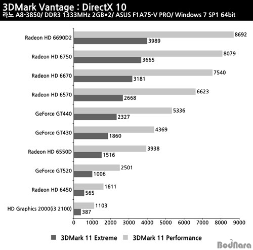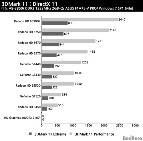 3DMark 11¿¡¼ A8-3850 ³»Àå ±×·¡ÇÈ ÄÚ¾îÀÎ HD 6550D´Â ÁöÆ÷½º GT 430±ÞÀÇ ¼º´ÉÀ» ¹ßÈÖÇϸç, HD 6670°ú µà¾ó ±×·¡ÇÈ ±¸¼º ½Ã ¸ÞÀνºÆ®¸²±ÞÀÎ HD 6750À» ¶Ù¾î³Ñ´Â ¼º´ÉÀ» Á¦°øÇÑ´Ù.