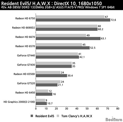 DirectX 10À» Áö¿øÇÏ´Â Resident Evil5¿Í H.A.W.X¿¡¼ HD 6550D´Â Æò±Õ 24ÇÁ·¹ÀÓ°ú 30.4 ÇÁ·¹ÀÓÀ¸·Î ¹«³ÇÑ ¼º´ÉÀ» Á¦°øÇÑ´Ù.