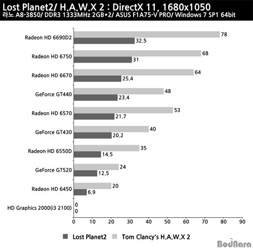 DIrectX 11À» Áö¿øÇÏ´Â Lost Planet2¿¡¼ HD 6550D´Â Æò±Õ 14.5 ÇÁ·¹ÀÓÀ¸·Î ¿øÈ°ÇÑ Ç÷¹À̰¡ ¾î·ÆÁö¸¸ H.A.W.X 2¿¡¼´Â Æò±Õ 35 ÇÁ·¹ÀÓÀ¸·Î ¿øÈ°ÇÏÁö´Â ¾ÊÁö¸¸ ¹«³ÇÑ Ç÷¹À̰¡ °¡´ÉÇÑ Á¤µµÀÇ ¼º´ÉÀ» Á¦°øÇÏ´Â °ÍÀ» ¾Ë ¼ö ÀÖ´Ù.
