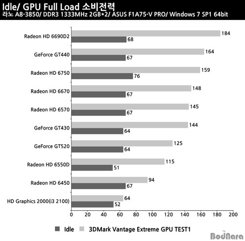 Idle ½Ã HD 6550D ½Ã½ºÅÛÀÇ Àüü ¼ÒºñÀü·ÂÀº 51W·Î ÄÚ¾î i3 2100ÀÇ HD Graphics 2000°ú ºñ½ÁÇÑ ¼öÁØÀ̸ç, ´Ù¸¥ ¿ÜÀå ±×·¡ÇÈ Ä«µå¸¦ ÀåÂøÇßÀ» ¶§ º¸´Ù 10W ÀÌ»ó Àü·Â ¼Òºñ°¡ ³·´Ù.