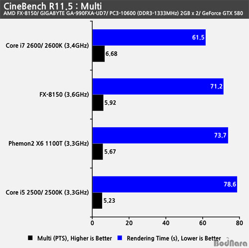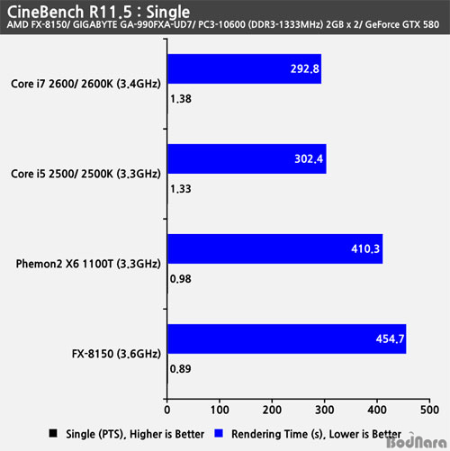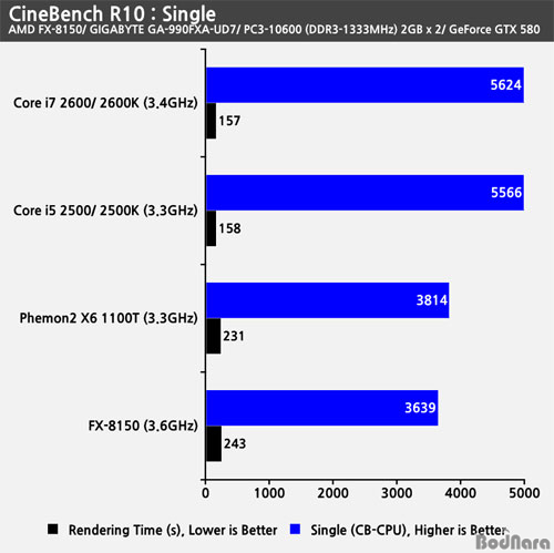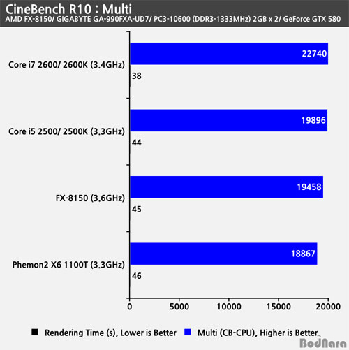 AMD FX-8150Àº 3.60GHz·Î 3.30GHzÀÇ Æä³Ñ2 X6 1100Tº¸´Ù ³ôÀº µ¿ÀÛ Å¬·°À» °®°í ÀÖÁö¸¸, ½Ì±Û ½º·¹µå ÀÌ¿ë½Ã¿¡´Â ó¸® ¼º´ÉÀÌ Ç϶ôµÈ´Ù. ¸ÖƼ ÄÚ¾î/ ½º·¹µå°¡ Ȱ¿ëµÇ´Â ¸ÖƼ Å×½ºÆ®¿¡¼­´Â Æä³Ñ2 X6 1100T¸¦ ¿ªÀüÇϰí ÀÖÀ¸³ª °æÀï Á¦Ç°¿¡´Â ´À¸° ·»´õ¸µ ½Ã°£ ¹× ÀÛ¾÷·®À» Á¦°øÇÑ´Ù.