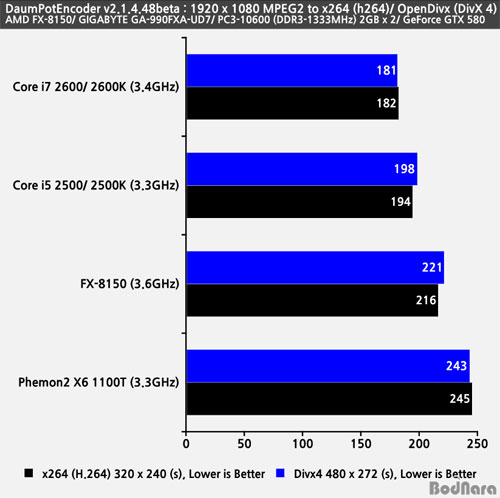 ´ÙÀ½ ÆÌÀÎÄÚ´õ´Â ¸ðµÎ ³»Àå ÄÚµ¦°ú ¼¼ºÎ ¼³Á¤¿¡¼­ ÄÚ¾î ¼ö¿Í ½º·¹µå ¼ö¿¡ ¸ÂÃß¾î ¼³Á¤ÇÑ ÀÌÈÄ Å×½ºÆ®¸¦ ÁøÇàÇÑ °á°ú AMD FX-8150Àº °°Àº AMD °è¿­¿¡¼­´Â Æä³Ñ2 X6 1100Tº¸´Ù ºü¸¥ Æ®·£½ºÄÚµùÀÌ °¡´ÉÇßÀ¸¸ç, ÄÚ¾î i5 2500K¿¡µµ ÀÌÀü¼¼´ëº¸´Ù ±ÙÁ¢Çß´Ù. ±×·¯³ª, ¿©ÀüÈ÷ ÀÎÅÚ °è¿­º¸´Ù ºÒ¸®ÇÑ ¸ð½ÀÀÌ´Ù.