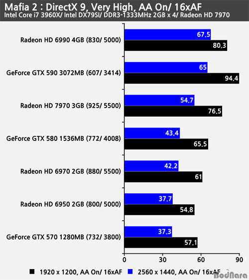 Àû¿ëÇÏÁö ¾ÊÀº °á°ú¿Í ¸¶Âù°¡Áö·Î ¶óµ¥¿Â HD 7970Àº ´ÜÀÏ GPU Áß ³ôÀº ¼º´ÉÀ» Á¦°øÇß´ø ÁöÆ÷½º GTX 580À» Á¦Ä¡°í µà¾ó GPUÀÎ ÁöÆ÷½º GTX 590¿¡ º¸´Ù ±ÙÁ¢ÇÑ ÇÁ·¹ÀÓÀ» ³»ÁØ´Ù.  ¶óµ¥¿Â HD 7970Àº 2560 x 1440 ÇØ»óµµ¿¡¼ ÁöÆ÷½º GTX 580°ú ºñ±³ÇØ 36.65%°¡ Çâ»óµÇ¾úÀ¸¸ç, ¶óµ¥¿Â HD 6970 ´ëºñ 35.39%°¡ Çâ»óµÇ¾ú´Ù.   Mafia 2 : DirectX 9, AA On/ 16xAA